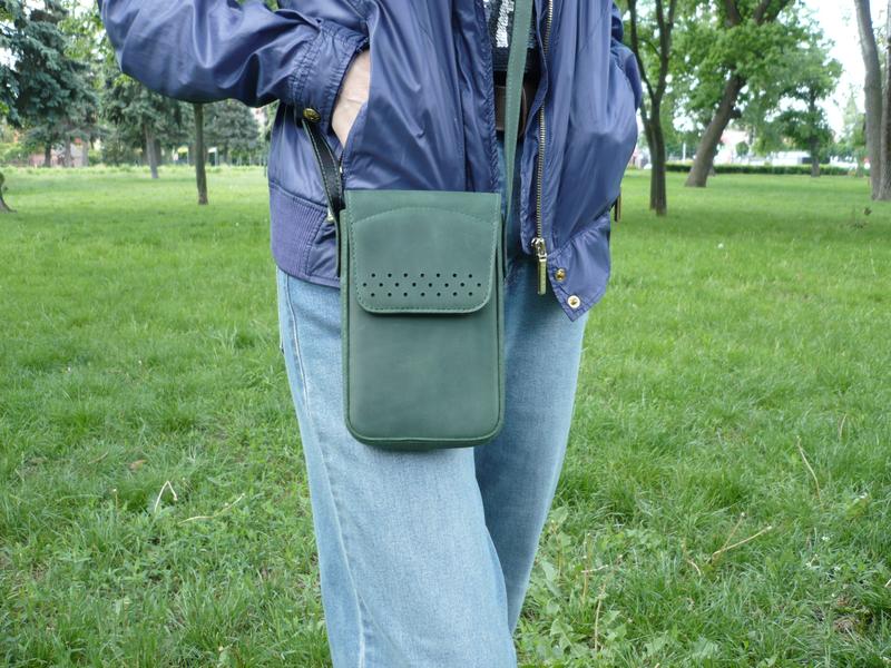 Шкіряна сумочка для телефону. Шкіра ВРХ «crazy horse», колір зелений-хвоя. Одне відділення , внутрішня кишеня , задня кишеня . Клапан фіксується магнітною кнопкою. Розмір: 180*120*25 мм. Сумочка прощита вощеною ниткою, фінішне покриття - крем IEXI wrens dubbin (Італія). Ручна робота. Цінність: 1100 грн.