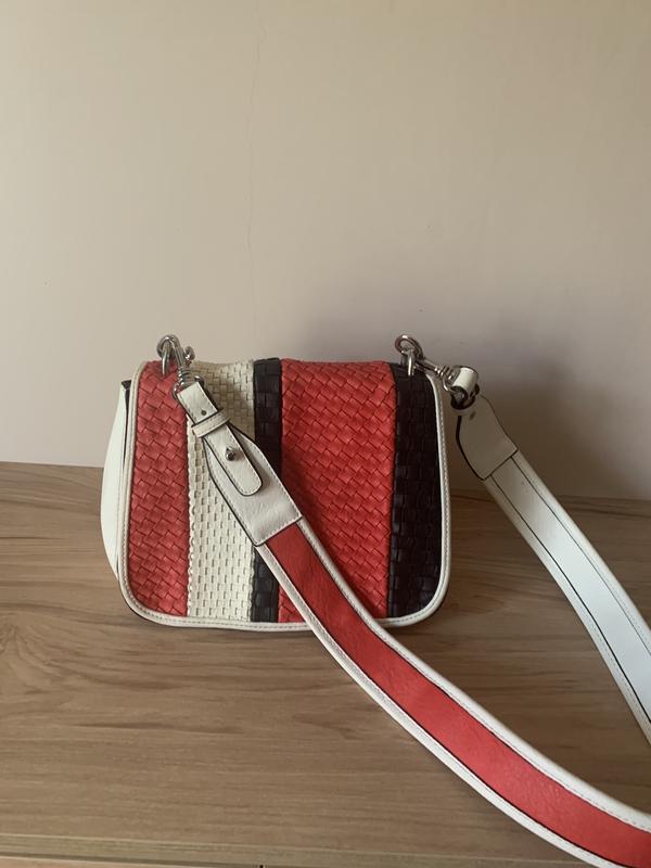 Сумка Marella (Max Mara) Оригинальная сумка на широком ремешке из искусственной кожи Качественная фурнитура Спереди на клапане яркая отделка из плетеной экокожи черного,красного и белого цвета. Вместительная,внутри два отделения с караманами. Высота сумки 20 см, ширина по верху 22 см,по низу 24 см,глубина 9 см по низу. Длина ремешка с фурнитурой 105 см Высота 50 см