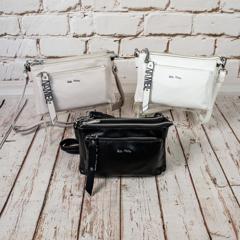 Оригинальная маленькая сумочка. Материал - эко кожа. Аксессуары - никелированные. Одна длинная регулируемая ручка. Максимальная длина ручки 135 см. Сумка может носится через плечо cross body. Сумка закрывается на металлические молнии. На лицевой стороне расположен накладной карман на металлической молнии с декоративным бегунком. На задней стороне расположен горизонтальный прорезной карман на молнии