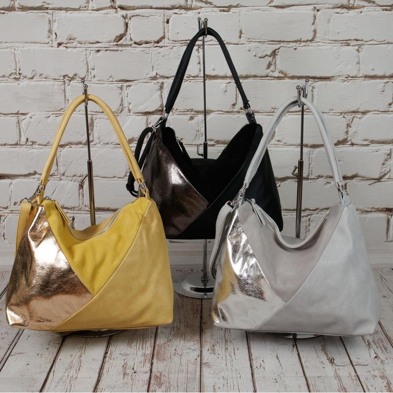 Материал - комбинация эко кожи и натуральной замши. Аксессуары - никелированные. Сумка закрывается на металлическую молнию. Две средние нерегулируемые ручки. Высота ручки - 33 см. Дополнительно имеется длинная регулируемая ручка. Максимальная длина ручки - 130 см. На лицевой стороне сумка украшена вставками из натуральной замши. На задней стороне расположен горизонтальный прорезной карман на молнии. Внутри - тканевая подкладка, три отделения.