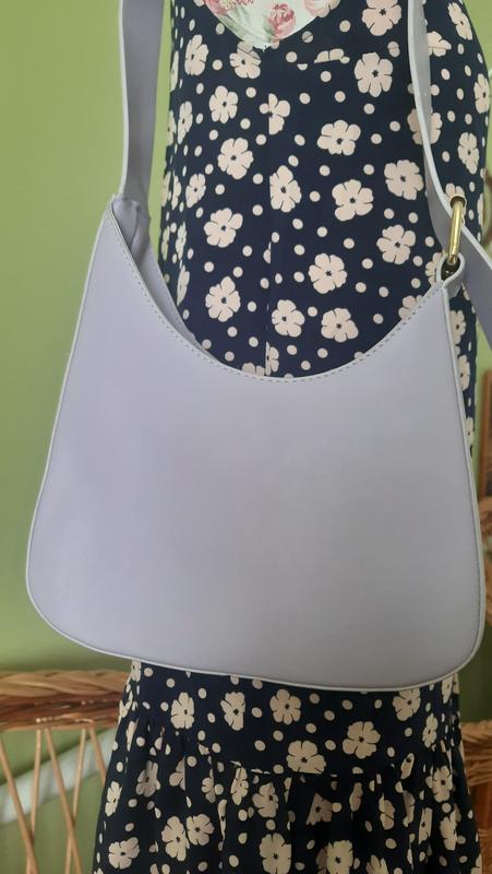 Модная сумочка с регулируемой ручкой нежного лавандового цвета. Один внутренний карман, фурнитура золотистая.