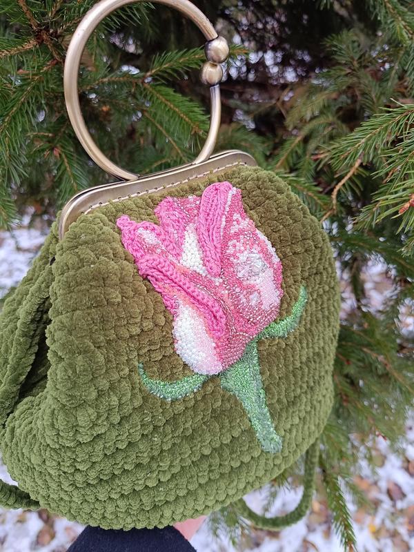 Сумка в'язана, вишита бісером та муліне. Денце з натуральної шкіри. Застібка на фермуар. Підкладка пошита з італійської тафти. В єдиному виконанні без повторів.