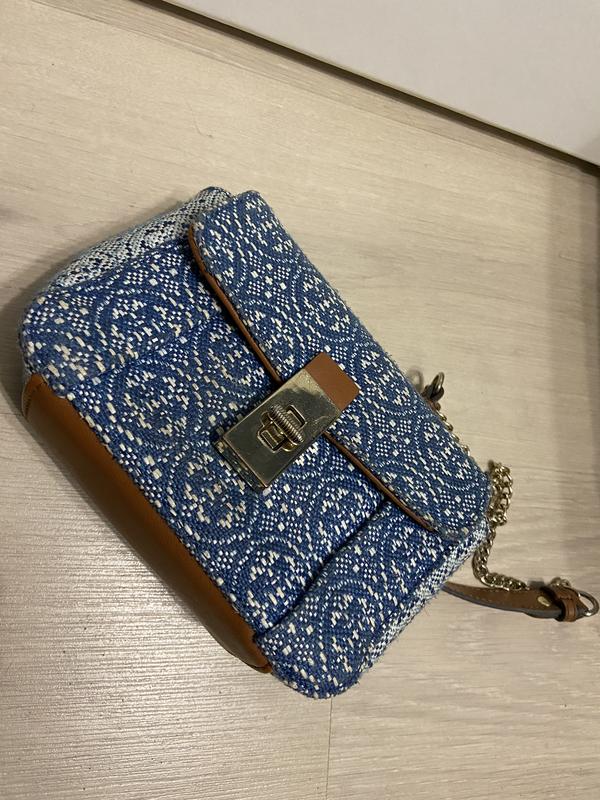 Маленькая сумочка Parfois, на цепочке, выполнена из плотного тканевого материала с вставками из полиуретана. Цвет голубой белый с светло-коричневыми вставками. Размеры: 18х13х7 см. Имеет незначительные пятна которые видны на фото.