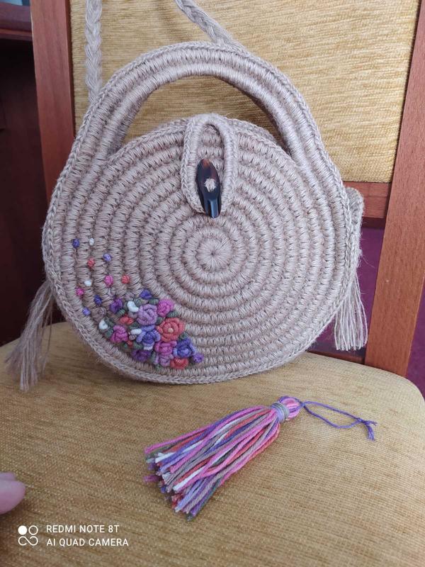 Сумочка из натурального джута ручной работы диаметр 28см с вышивкой