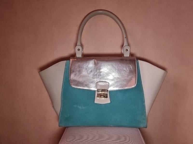 Кожаная сумка Roberta Biagi комбинированная лаковая светло-серая кожа, замша цвет Tiffany и серебряная кожа. Фурнитура мягкое лимонное золото. Размеры ширина дна 34 см Высота без ручки 28 см Высота с ручкой 46 см Глубина дна 11,5 см Сама широка частина сумки 50 см