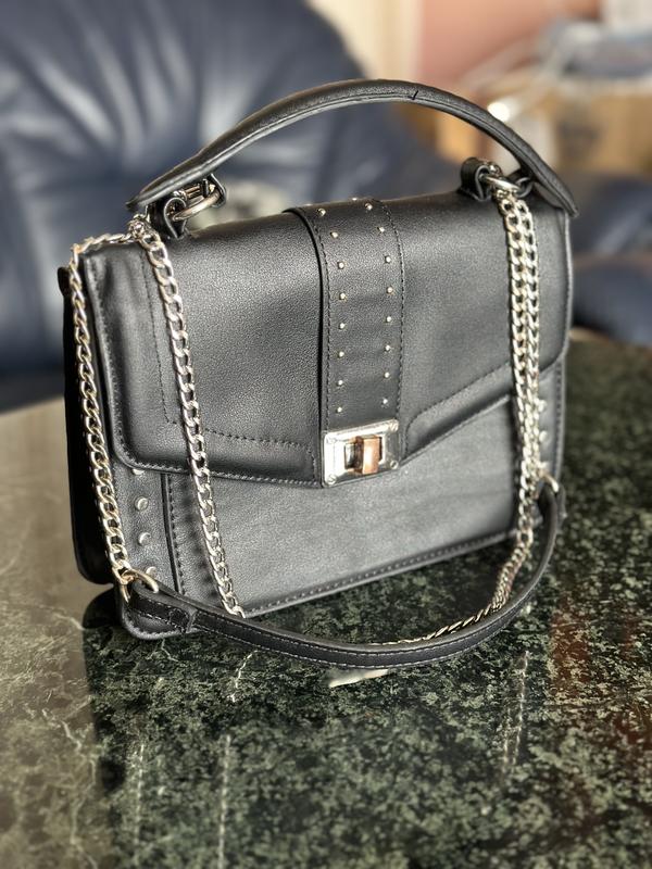 Черная сумка. Ремень на цепочке, можно складывать в двое. Один общий отдел и маленький кармашк на замке. Легкая. Застежка чуточку стерлась но рабочая.