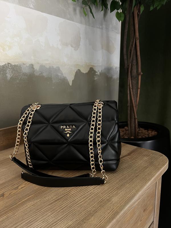 Средняя женская сумка. Изготовлена из высококачественной экокожи, украшена логотипом золотого цвета в фирменном стиле Prada. Есть два отделения с черной замшевой подкладкой, небольшая нашивка из экокожи с надписью бренда и два гаманеца на молнии. Сумка имеет двойную цепочку с плечевыми вставками длиной 120см. 📐 Размер: 25/18/12 🛍️Бесплатная упаковка: брендовая коробка, наполнитель, брючин, документы.