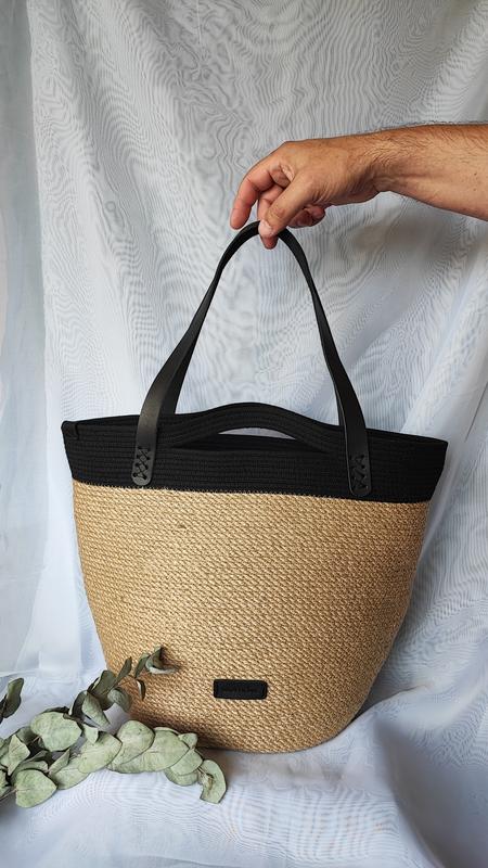 джутовая сумка с черным кантом и кожаными ручками размер дна 24х17см, высота 32см, верх 45см ручки 60см есть молния и внутренний карман