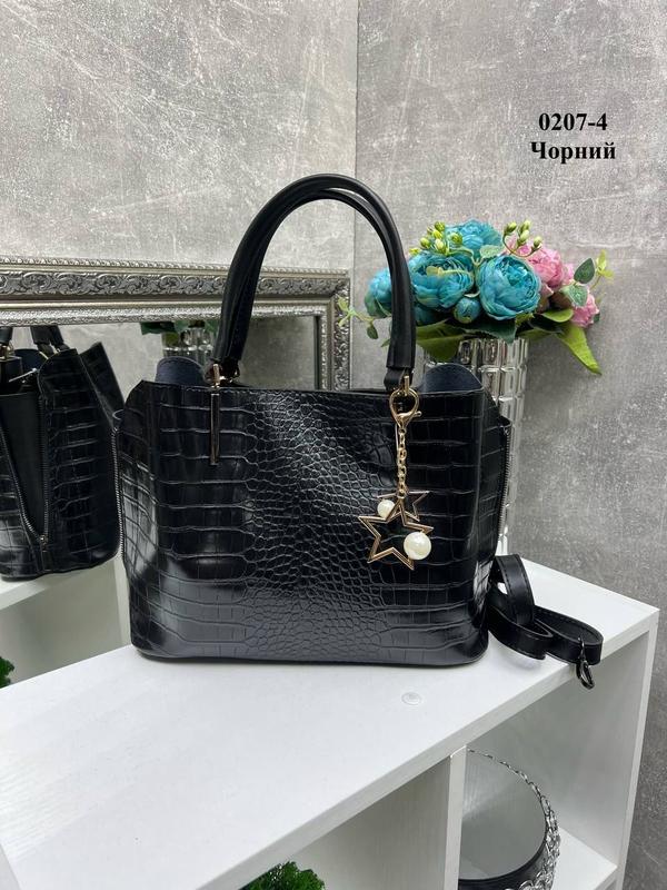 Эко кожа с крокодиловым принтом. 30 см ширина по дну. 27 см ширина зверху. 23 см высота. 12 см Глубина. Высота ручек 16 см. Три отделения: среднее отделение на молнии, внутри карман для телефона и внутренний карман на молнии. Остальные два отделения на магните. По бокам сумки молнии, позволяющие увеличить внутренний объем. Максимальная длина плечевого ремня 130 см