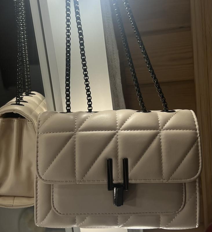 сумочка приятного молочного цвета, с черным глянцевым ремешком. имеет 2 отделения, разделяемых карманчиком на застежке. 20/14 также есть маленький карман (последняя фотография)