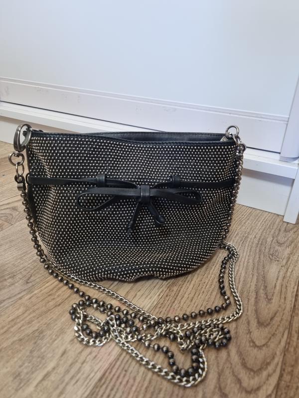 Сумочка zara Состоянин очень хорошее ▪︎Состав 100% натуральная кожа ▪︎Цвет черный ▪︎Ремешок через плечо двойная цепь, идет без замка как мешочек, внутри кармашки ▪︎Размер ширина верх26/22 висота