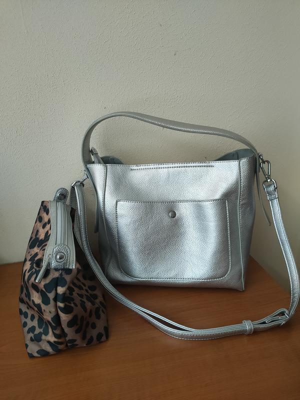Сумка Polina & Beiterou серебристого цвета. В середине съемная косметичка.