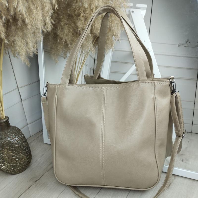 Большая, вместительная сумочка♥️ Вмещает формат А4 Код Д584 Цвет: беж. ✅ Материал: очень приятная на ощупь эко кожа Турция, подкладка-плотная ткань. ✅Размеры: 31 см ширина по дну. 37 см ширина вверху. 33 см высота. 10 см дно. Висота ручок 24 см. Довжина плечового ременя 110 см. ✅Особенности: Одно отделение на молнии. В середине потайной карман на молнии.