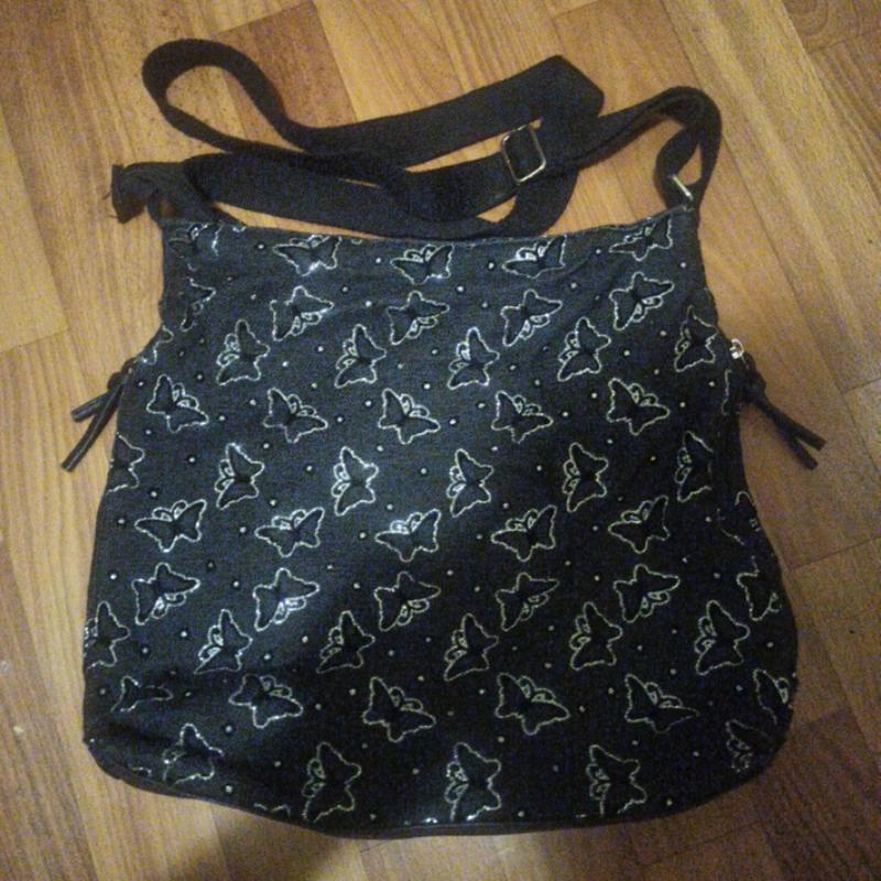Сумка женская, принт бабочки,цвет черный, внутрь карманы, сзади карманчик, на молнии, длина ручка, статус отличный.Беспечный союз.Цена 220грн