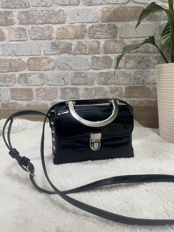 Каркасная лакированная сумка в хорошем состоянии, длина -13см, ширина-18см, глубина-7см, ручка-120см.
