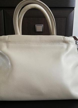 Шкіряна сумка, з двома знімними ременями, підкладка всередині виробу щільна, всередині сумки багато функціональних кишень. Шкіра м'яка, дуже приємна, дно укріплене, не провалюється. Довжина сумки — 32 см, висота — 24 см, висота основних ручок — 12 см.Сумка куплена в магазині,на сайті та бирці магазину було заявлено, що сумка виробництва Іспанія.Колір-бежевий.
