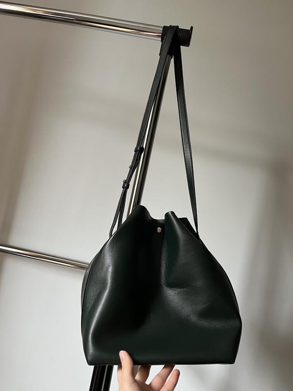 Кожа. Есть дефекты (на фото). Снизу идеальное состояние. Темно-зеленый цвет, можно носить в нескольких вариациях