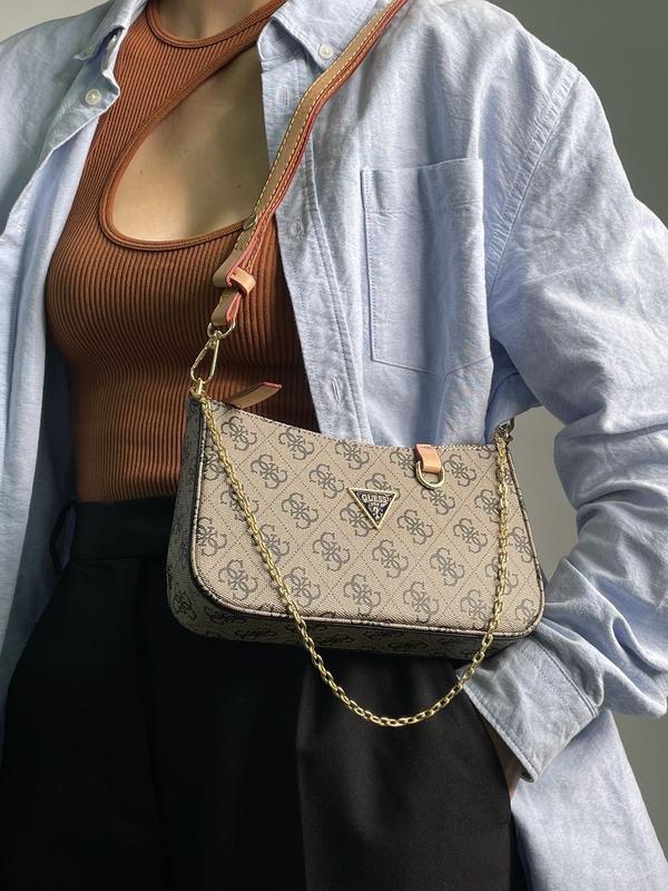 👜 Guess Mini Bag 📐 Размер: 20 х 12 х 5 см 🧵 Материал: Эко Кожа 🔎 Описание: Сумка выполнена из гладкой эко кожи с фирменным принтом. Внутри одно небольшое отделение. Ремешок из экокожи, на карабинах. Регулируется ремешок на заклепках от 60 до 105 см. Также есть небольшая золотистая цепочка на карабинах. Подкладка внутри сумки из текстиля с фирменными надписями. Комплектуется в брендированной коробке и бумаге (за дополнительную плату можно приобрести документы, пыльник и фирменный пакет).