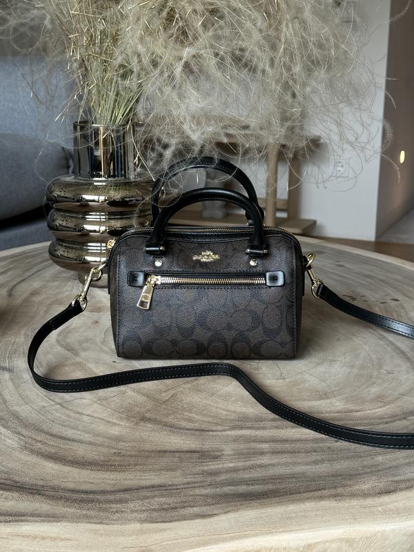 Арт: 99441 <unk> 3300 грн <unk> Размер: 19.5 х 14 х 11 см <unk> Материал: Кожа Сумка небольшого размера, выполнена из гладкой кожи с фирменной канвой. Внутри одно отделение, также есть карман на молнии с фирменной нашивкой. Снаружи на лицевой стороне также имеется дополнительное отделение на молнии. Подкладка внутри из качественного текстиля. Фурнитура металлическая и брендированная. Кожаный ремешок на карабинах для ношения через плечо - имеет регулируемую длину. Комплектуется в брендовую коробку и пыльник.