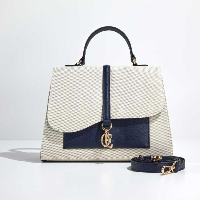 46522 Сумка через плечо Dune Изготовлена из темно-синей искусственной кожи и органического хлопка песочного цвета с добавлением переработанного полиэстера. Передний карман, украшенный изогнутой застежкой-кнопкой и золотистым брелоком Oriflame Exklusiv, подойдет для хранения солнцезащитных очков или телефона. Съемный плечевой ремень в комплекте. Д: 20,7 x Ш: 6,5 x В: 12,5 см.