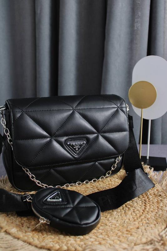 👜 Prada Re-Nylon Padded Shoulder Black 💰Цена: 1699грн ◾️Размер: 24 х 16 х 8см ◾️Материал: Эко Кожа ◾️Фирменная коробка ◾️Фирменный брючин + Бумага 🔎 Описание: Сумка изготовлена из черной эко-кожи, простроченной. Внутри одно большое отделение и маленький кармашек на молнии. Подкладка внутри сумки текстильная, с логотипами Prada. На ремешке есть небольшой кошелек на молнии. Есть длинный ремешок на карабинах, так же декоративная цепочка.