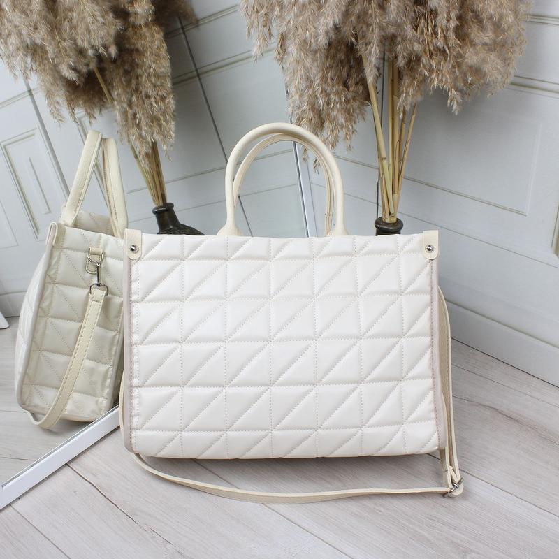 🔥Большая вместительная сумка. Вмещает формат А4♥️ Цвет: молочный Материал: эко кожа Подкладка -плотная ткань Размер: ширина 35см, Высота 25 см, дно 12 см. Высота ручек 14 см. Ремешок регулируется до 120 см Сумка закрывается на молнию, в середине открытый карман и потайной карман на молнии. Производство 🇺🇦