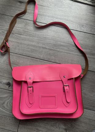 Яркая сумка Satchel на длинном ремешке (регулируется). Стан - почти идеален (использовались несколько раз, остальноежигало в шкафу, немного принудилась от этого, но с вещами внутри расправится). Размеры 31 на 24 см. Внутри одно большое отделение и передний карман. На местах сгиба слегка потрескавшаяся краска (на фото).