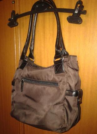 Сумка коричневого цвета из плащевой ткани с кожаными ручками..В сумке есть много карманов. Снаружи - две большие на молнии и две маленькие по бокам. Внутри - два отделения: в первом два кармана на молнии, во втором два маленьких кармана. Сумка в удовлетворительном состоянии,на ручках немного отслоилась кожа. Размеры 25х20х14 см.