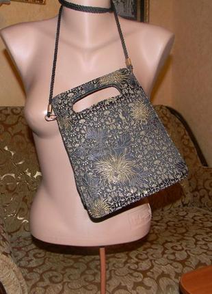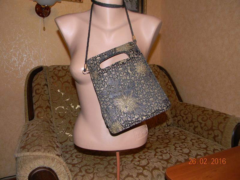 маленькая сумочка.текстиль с золотистым напылением. Новая.Замеры сделаю при необходимости.Высота 23см,ширина вверху-15,5см,в низу 19см,ширина снизу с боку-6см.сверху две кнопки-магниты.Длинный шнурок.