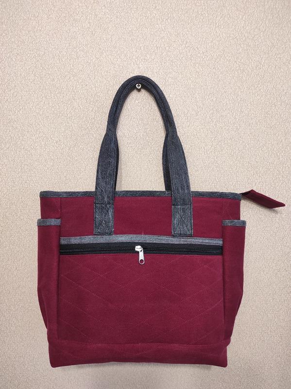 Сумка багряна, джинсова, пряма. Сумка имеет глубокие боковые карманы, передний карман на замке, задний карман двойной. Сумка застегивается на замок, в середине есть подкладка и карманы на замке и двойная. Ручка позволяет носить на плече. Сумка плотная красиво держит форму. Размер: высота 27 см, ширина 28 см, ширина дна 11 см, высота ручки 20 см