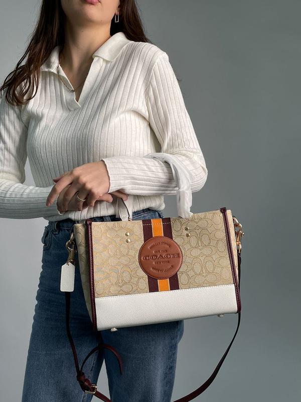 👜 Coach Dempsey Tote 22 In Signature Jacquard With Stripe (Арт: 99059) 💵 3000грн 📐 Размер: 29 x 21 x 11 см 🧵 Материал: Текстиль, Кожа 🔎 Описание: Сумка изготовлена из брендового текстиля и кожи. Имеет одно большое отделение, также есть небольшой карман на застежке. Подкладка внутри из качественного текстиля, на ощупь напоминает замшу. Главное отделение закрывается за счет магнити-клапани.стура напоминает замшу. Фурнитура очень качественная, металлическая и брендированная. В комплекте есть длинный узкий ремешок на карабинах с регулируемой длиной, для ношения через плечо.