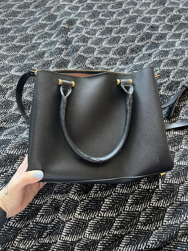 Невеличка сумка зі штучної шкіри. В ідеальному стані, майже не носила. Доволі містка. Має розділення на два відсіки, одну невелику кишеню на замочку та ще одну пласку кишеню на стінці всередину (на третьому фото видно). Має короткі ручки і довгий ремінець. Дно тверде, тримає форму Розмір: 26х24х11 (це по нижньому краю, зверху трошки вужча, десь на 2 см)