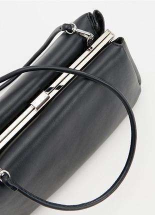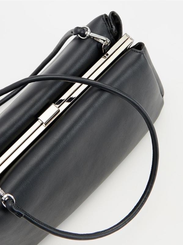 Женская сумочка минималистичного кроя из классического материала чёрного цвета . Кнопка закрытия. Узкий съемный плечевой ремень . Гладкая подкладка внутри. Размеры сумки : 18 # 30 # 13 см .Материал 100% полиуретан .