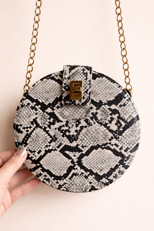 міні сумочка кругла. з принтом під змію. чорно біло сірі кольори. фурнітура золотиста. на ланцюжку. еко шкіра. ефектна.
