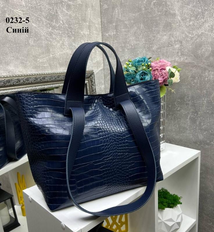 Турецкая экокожа с крокодиловым принтом. Ширина по дну 34 см. Ширина вверху 44 см. Высота 30 см. Дно 15 см. Высота длинных ручек 30 см. Одно отделение на молнии, разделенное пополам перегородкой на молнии. Внутри открытый карман и карман на молнии. По бокам сумки карабины для затягивания уголков внутрь. Над основной молнией кнопка. На обратной стороне карман на молнии Ассортимент сумок, рюкзаков пополняется ежедневно Следите за новинками. Есть отправка по Украине. Накладка по минимальной предоплате У нас всегда можно приобрести: