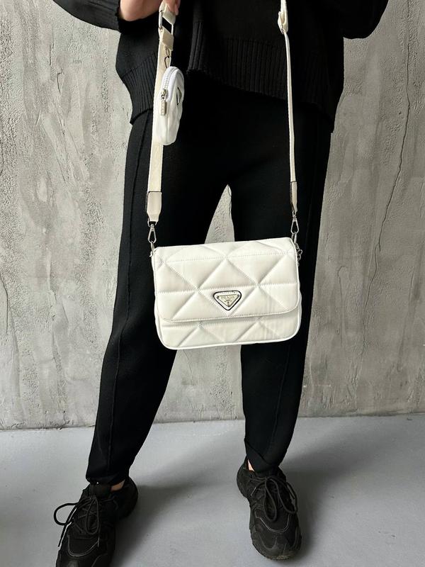 📐 Размер: 24 х 16 х 7 см 🧵 Материал: Эко Кожа 🔎 Описание: Сумка изготовлена из эко-кожи, простроченной. Внутри одно большое отделение и маленький кармашек на молнии. Подкладка внутри сумки текстильная, с логотипами Prada. На ремешке есть небольшой кошелек на молнии. Есть длинный ремешок на карабинах, так же декоративная цепочка. Упаковка: Брендированная коробка с крафтовой бумагой