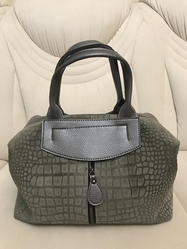 Сумка женская, практически новая. Очень хорошего качества, экозамш и экокожа. Внутри одно большое отделение, также есть отделение для телефона достаточно вместительное по размеру, и два мягких на замотках отделения. Размер сумки : высота 29 см, ширина 36 см, глубина 14 см