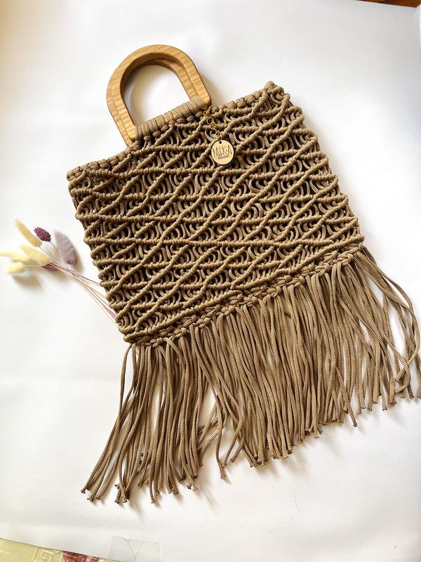 Макраме сумка Полностью ручная работа Размер ручек: 12*12 см, древесные Размер сумки: 33*28 см(с бахромой 33*48см)