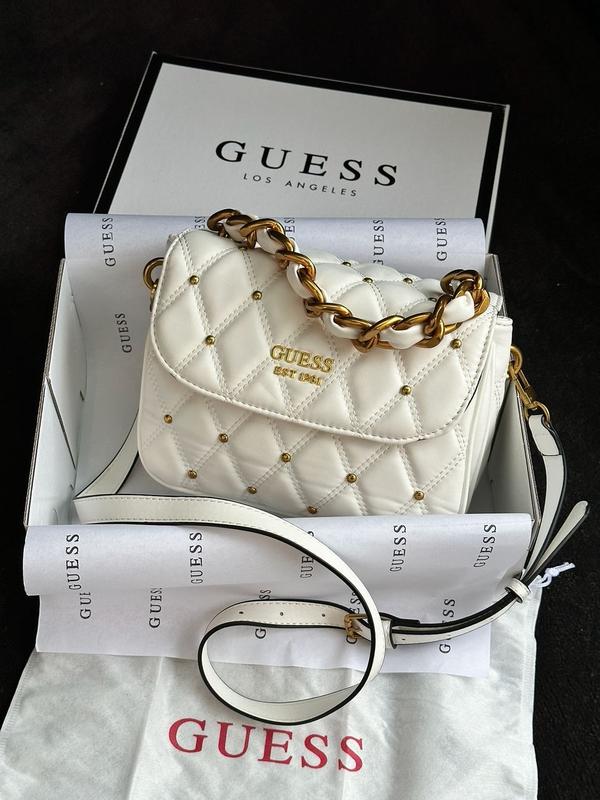👜 Guess Triana Flap Shoulder Bag White (Арт: 99057) 💵 Цена: 1750 грн 📐 Размер: 22 х 16 х 8 см 🧵 Материал: Эко Кожа 🔎 Описание: Сумка выполнена из гладкой кожи, прострочена, с металлическими пинами. Внутри два отделения, есть также карман на застежке. Подкладка из брендированного текстиля. Закрывается отделение на магните-клапане. Ремешок для ношения через плечо из эко кожи, с регулируемой длиной. Комплектуется в брендированной коробке и пыльнике.
