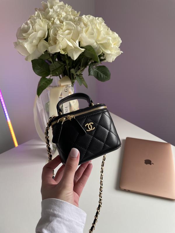 Арт: 99231 💵 3150 грн 📐 Размер: 11 х 10 х 7 см 🧵 Материал: Кожа 🔎 Описание: Сумка выполнена из гладкой кожи, имеет ромбовидную прострочку. Внутри одно небольшое отделение, есть еще меньше кармашек. Закрывается на застежке. Подкладка из плотного текстиля. Для носки в руке есть небольшая ручка, а через плечо - есть длинная тоненькая цепочка с вплетенной кожей (не отстегивается). Комплектуется в фирменной коробке на магнитах и пыльнике.