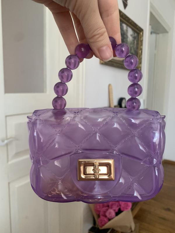 В наличии трендовая полупрозрачная мини сумочка в нежно-фиолетового цвета. Есть еще в нежно-желтом цвете и в цвете фуксия (ярко-розовая). Есть цепочка, можно носить через плечо. Размеры: 12,5 (ширина), 9,5 см (высота) Высота с ручкой 15,5 см