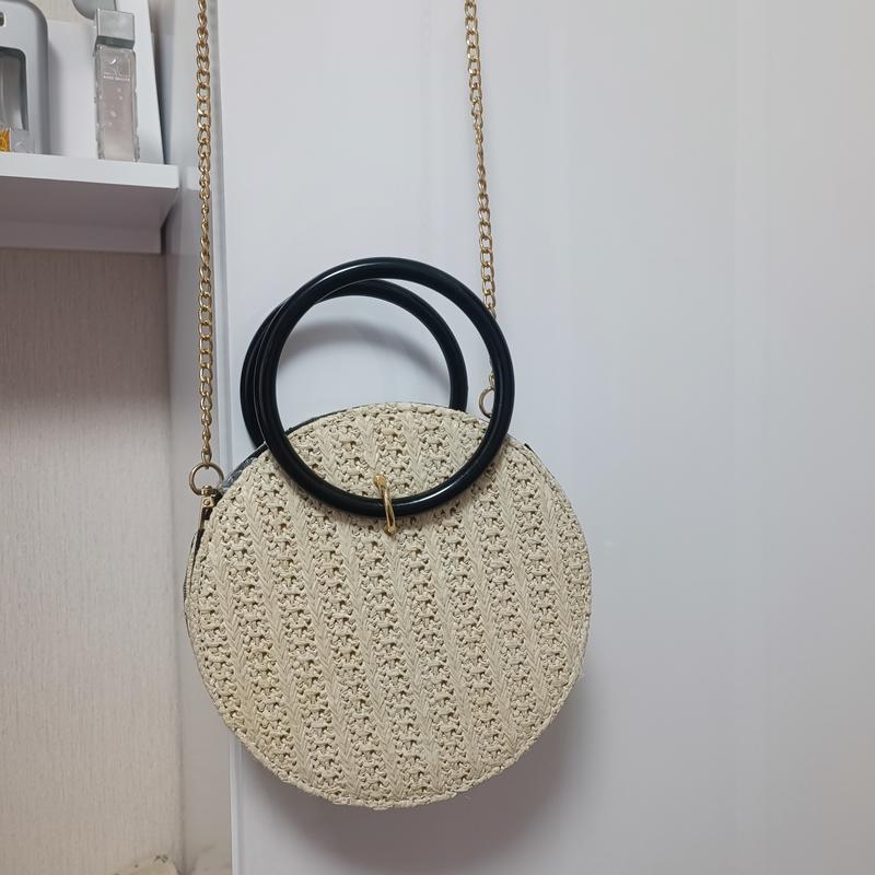 Плетеная сумочка на цепочке. Диаметр сумки 19,5см. Полная длина цепочки 120см. Можно отстегнуть. Внутри застежки нет, есть мешочек, который просто затягивается. Подойдет для отдыха,прогулки или фотосессии.
