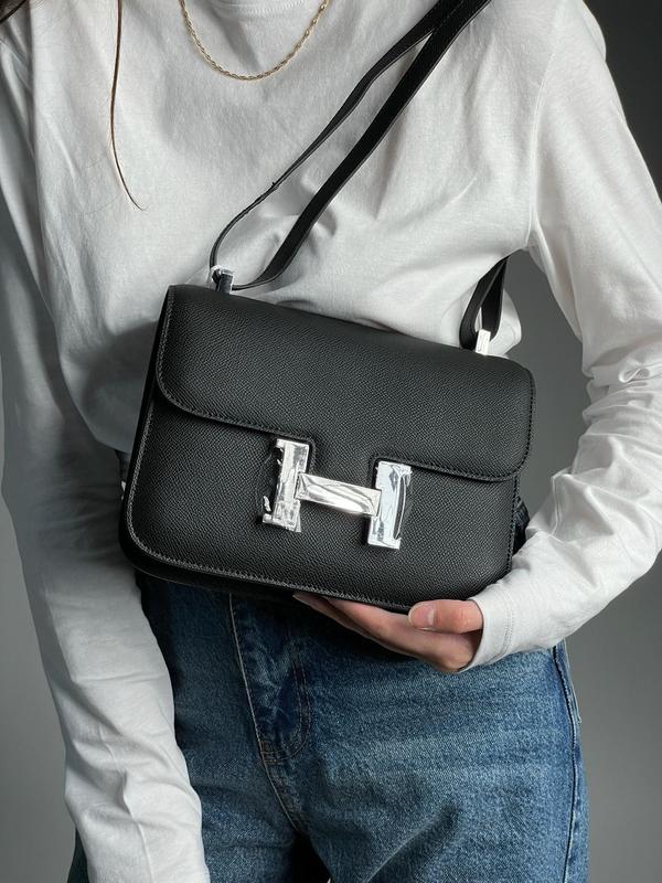 Black/Silver (Арт: 99170) 💵 3 400 грн 📐 Размер: 23 х 17 х 7 см 🧵 Материал: Кожа 🔎 Описание: Сумка выполнена из зернистой кожи. Внутри два отделения, также есть небольшой карман. Подкладка у сумки из черной кожи. Фурнитура металлическая, брендированная. Открывается благодаря нажатию на букву H (не перекладину), следует нажимать снизу-вверх. Ремешок узкий, имеет фиксированную длину.