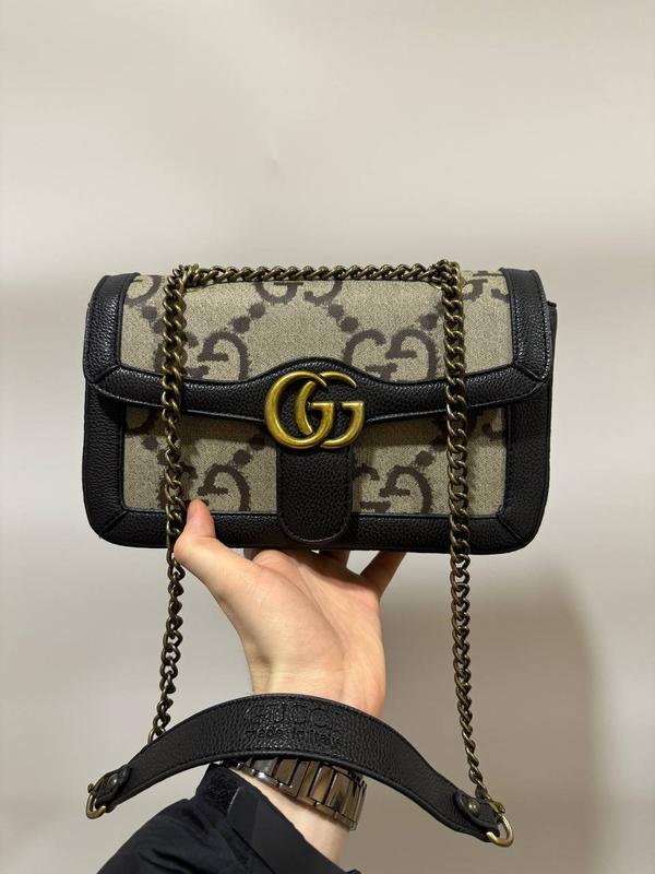 Gucci Размер: 28 х 16 х 7 см Материал: эко кожа, текстиль Описание: Люкс качество! Сумка выполнена из эко кожи, с нанесением монограммного логотипа бренду. Спереди расположена металлическая застежка. Внутри одно сплошное большое отделение с гравировкой названия бренда на задней стенке, а также с небольшим карманчиком на молнии. К сумке присоединяется металлический ремешок, со вставкой кожи посередине на которой нанесен логотип, длина 110 см. Бесплатный комплект: брендовая коробка + упаковочная бумага.