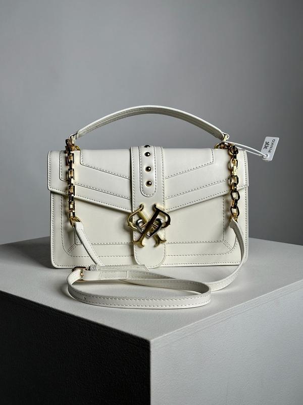 👜 Pinko Double P Large Icon Jewel (Арт: 99219) 💵 2700 грн 📐 Размер: 27.5 х 16 х 7 см 🧵 Материал: Кожа 🔎 Описание: Сумка выполнена из гладкой кожи, прострочена. Внутри два отделения, также есть еще одно на застежке с птичкой на коже. Подкладка внутри из тоненькой приятной на ощупь кожи. Для открывания нужно немного приспустить крышку вниз и выдвинуть из механизма штырь. Фурнитура металлическая, брендированная. На цепи переходящей в кожаную ручку для ношения через плечо - на каждом сении есть отдельная буква бренда. Комплектуется в брендированной гофро-коробке и пыльнике, есть пакет и буклетики.