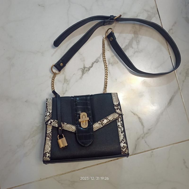 Кожаная. Качественная сумочка. Одно отделение большое и два по обе стороны одно на молнии. Все в идеальном состоянии.