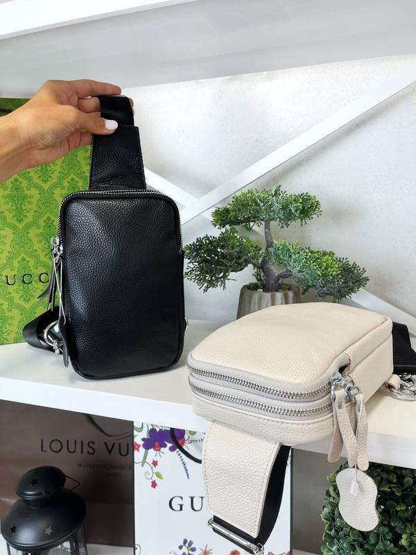 Код 828606 Сумка Кроссбоди унисекс кожа Размер: 20/14 Материал: натуральная кожа Ремешок регулируются в разных положениях для руки и плеча 2 отдельных отдела на молнии Черный ; светлый