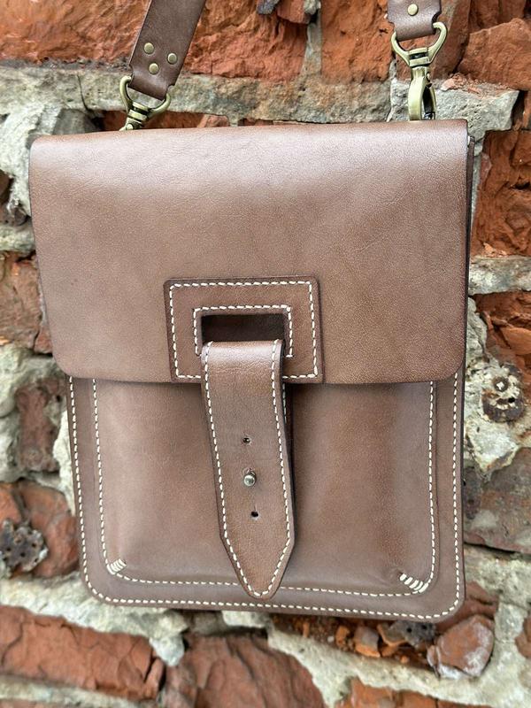 Данная модель изготовлена из кожи краст. Кожа дополнительно отполирована воском, что придало ей более дорогой винтажный вид. Кожа гладкая, плотная, шелковистая и тактильные ощущения от нее просто невероятные. Внутренние части сумки и торцы отполированы до гладкого состояния Сумка имеет довольно приличный размер - 24*20 см, и вполне вместительна. Имеет два отделения .На тыльной стороне сумочки есть карман на молнии. впереди открытый объемный карман. Внутри три открытых кармана. Закрывается сумка на кобурную кнопку. Ручка сумки регулируется от 110 см до 140 см. Цвет фурнитуры - антик. На заказ