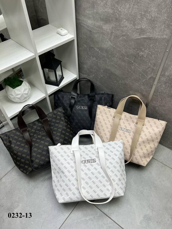 GUESS — вместительная и практичная женская сумка-трансформер Ширина по дну 32 см. Ширина зверху 42 см. Висота 30 см. Дно 14 см. Высота длинных ручек - 28 см. Фурнитура металл - цвет серебро. Одно отделение на молнии, разделенное пополам перегородкой на молнии. Внутри открытый карман и карман на молнии. По бокам сумки карабины для затяжки уголков внутрь. Над главной молнией кнопка. На обратной стороне карман на молнии. Турецкая экокожа.