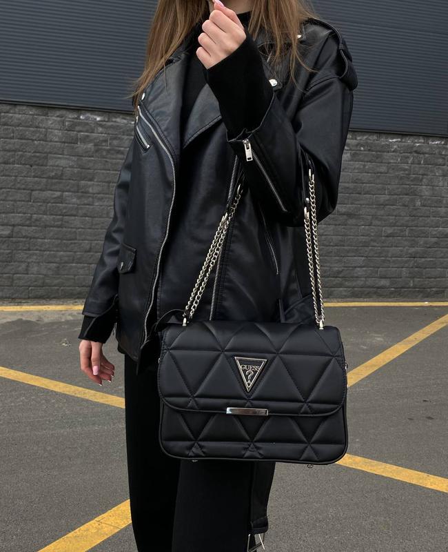 Сумка изготовлена из черной эко-кожи, прострочена. Внутри два больших отделения, между которыми отделение на молнии. Подкладка внутри сумки – текстильная с фирменными логотипами. Ремешок - это цепочки с ручками из эко-кожи, длину можно подстроить для ношения через плечо и в руке. Фурнитура металлическая, магнитная застежка.